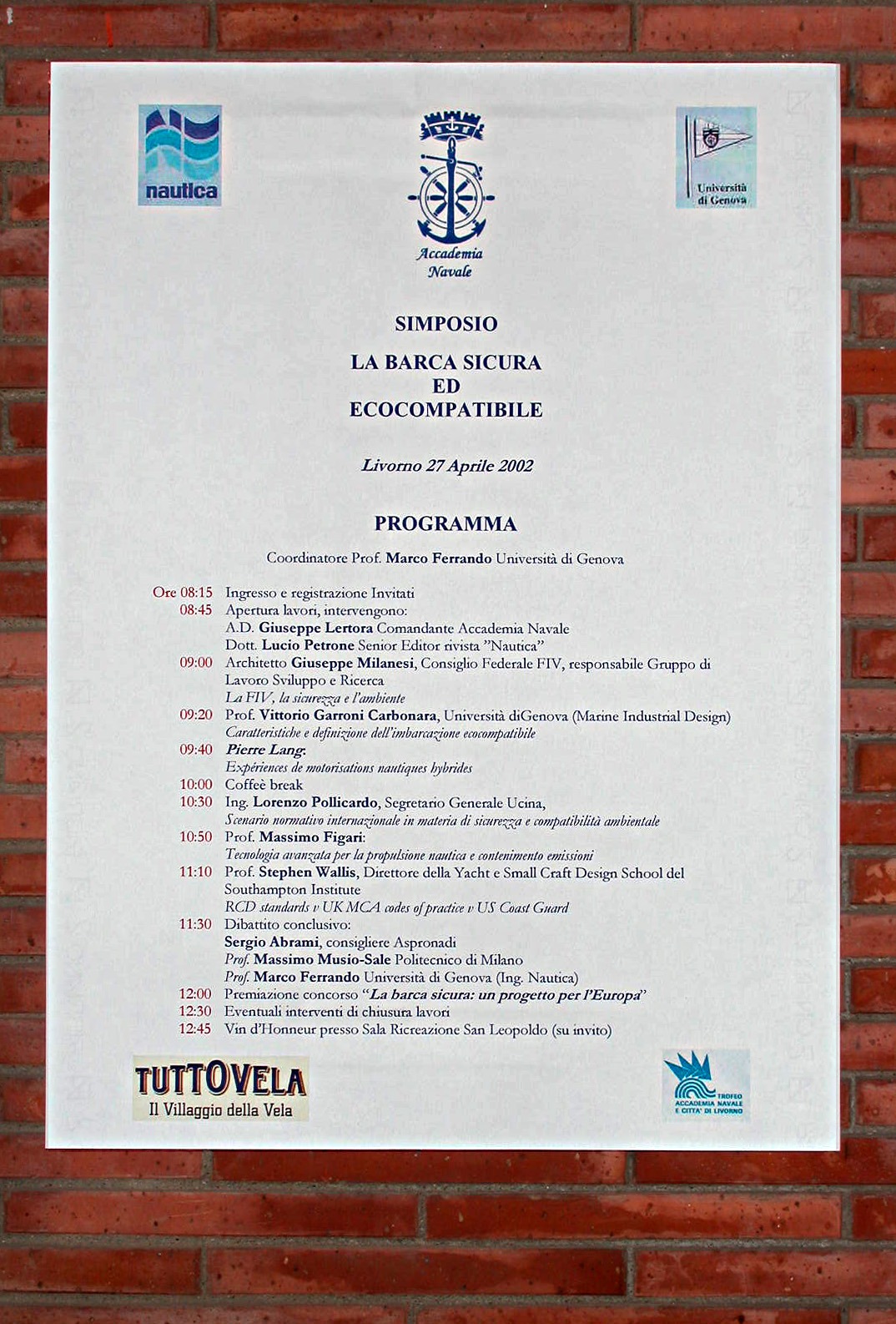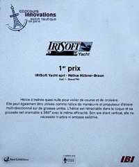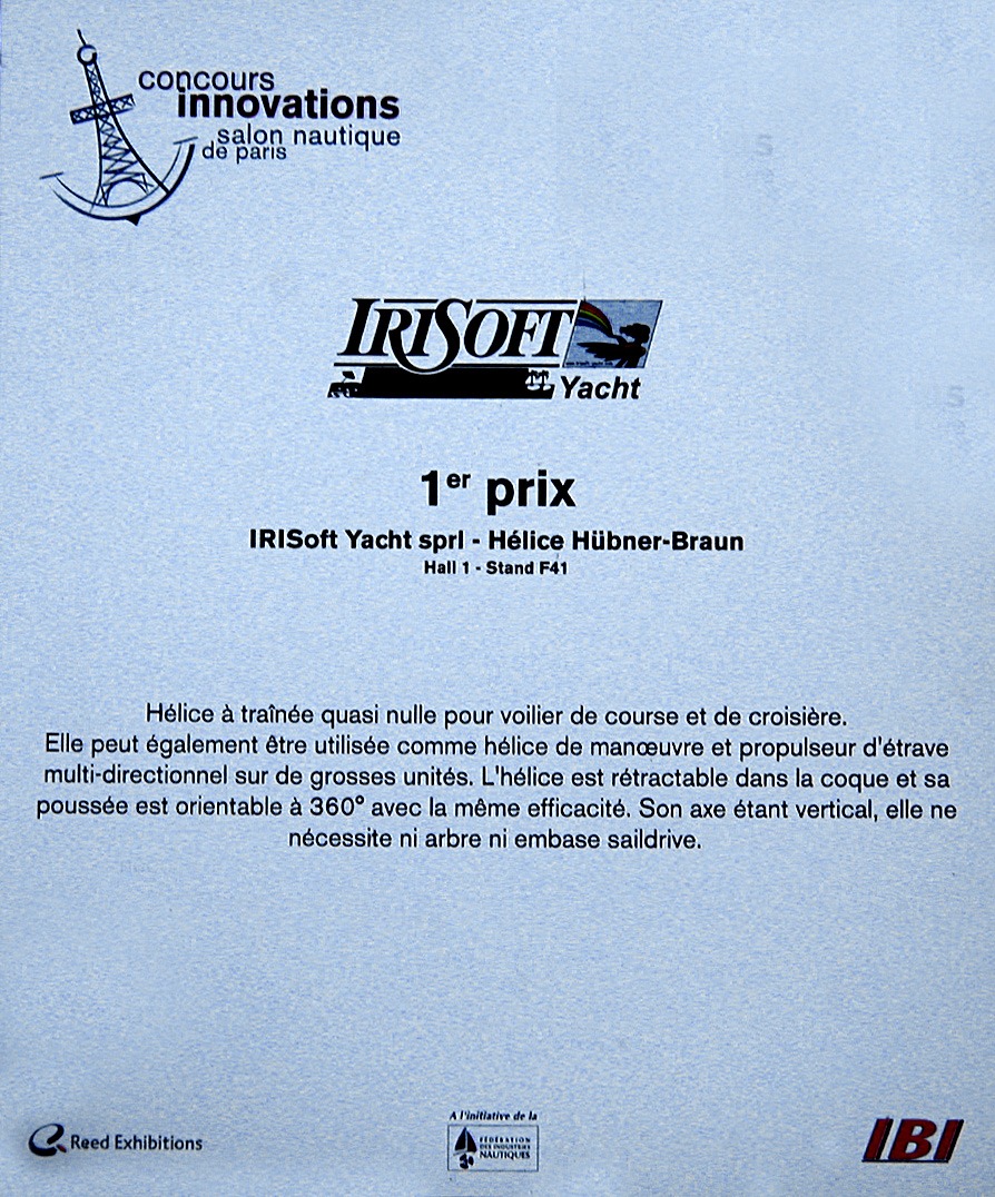 Premier prix "Bateau en Bois" au concours "Bois et bateaux" (IRISoft 40) + Conférence sur la propulsion diesel-électrique des voiliers. + Membre du jury du concours "Le bateau sûr et éco-compatible". Premier prix "Concours Innovations" (Hélice HÜBNER-BRAUN / SPW GmbH) Publie "Soluzione Innovativa - Propulsione diesel elettrica applicata alle imbarcazioni a vela" (texte et photos de Pierre Lang - traduction en italien de Sergio Abrami, architecte naval). JPG/ZIP (1.700 Kb)